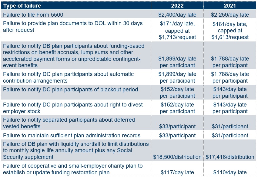 The chart below shows DOL’s maximum penalties relevant to single-employer defined benefit (DB) and defined contribution (DC) plans for 2022 and 2021. The increased amounts apply for penalties assessed after Jan. 15, 2022, for violations occurring after Nov. 2, 2015.